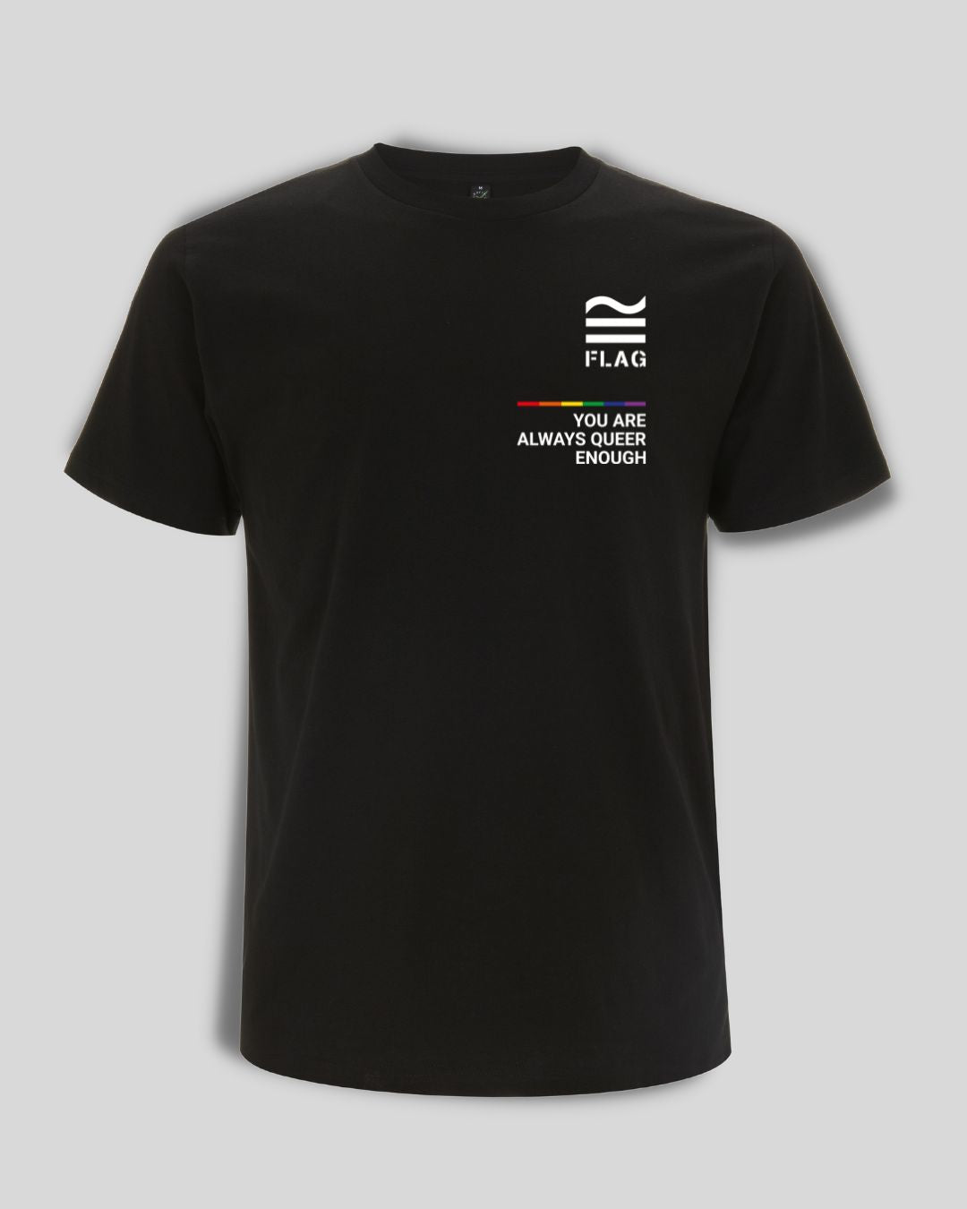 Dieses Shirt ist nicht einfach nur ein Kleidungsstück – es ist ein Teil unserer Community. Mit der klaren Message "You are always Queer enough" in Taschendruckgröße gepaart mit unserem einfarbigen Your Flag Logo trägst du ein Statement, das für Mut, Vielfalt und Zusammenhalt steht.